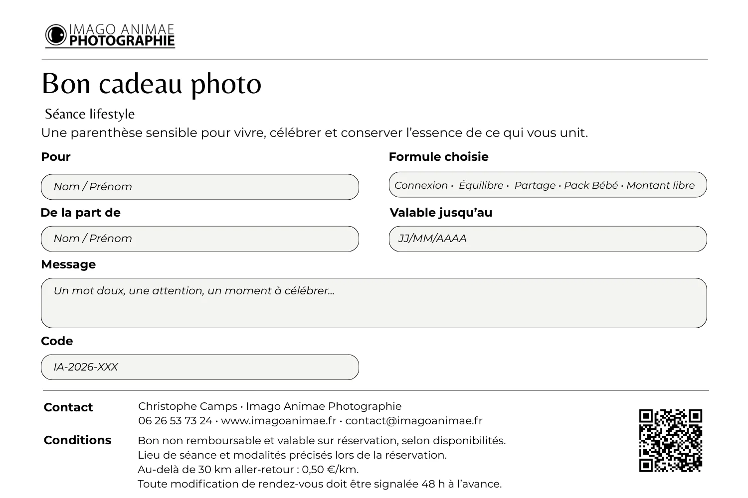 La séance peut se dérouler en extérieur, à votre domicile ou dans un lieu choisi ensemble, selon la saison, la lumière et l’esprit de votre projet.